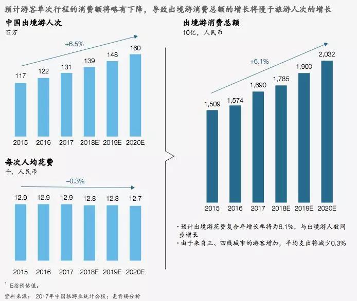 中国已然成为全球最大的出境游市场。2017年,中国出境旅游人次就超过了1.31亿,消费总额达1.69万亿,单次行程消费额位列全球首位。据麦肯锡预计,未来五年,出境游人数和消费总额都将保持6%以上的复合年化增长率。