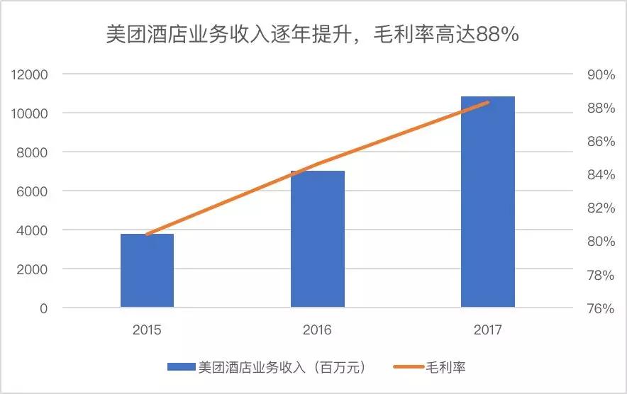美团酒店为美团盈利能力最强的业务分支,2017年酒店业务收入108.53亿元,同比增长54.6%;毛利率逐年提升,2017年高达88.3%,领先携程约6个百分点。