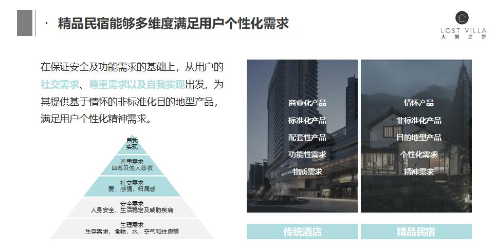 先谈自我实现,这里我提一个大乐之野的品牌标签,就是“适度的理想主义”。从我们最早的创业故事开始,两个年轻人放弃很多东西,跑到山里面去创业,这个故事本身就具有理想主义特征。然后我们给自己的行为和产品取了个名字叫“大乐之野”。我当时在翻《山海经》的时候就翻到了“大乐之野”这么一个词,它被后人称之为“被人遗忘的美好之地”。看到这个名字的时候,我就瞬间想到了它这非常符合我们想要做的民宿产品的特点:它很隐秘,它很安静,它符合我们这群人想要的个性化,符合我们这群人想要的尊重需求社交需求以及自我实现需求——我们都在寻找这片美好,而这片美好不太容易被人找到。