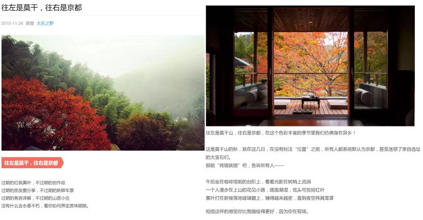 下面这张图,左边是莫干山,我们大乐之野碧坞村的三号楼门前景色,右边是京都的窗景。以往莫干山到了秋天就开始进入淡季,然而我们发现这是不应该的,我们记录了莫干山不同时节的美丽,并通过自媒体的方式传播出去,这个帖子当时我们起了一个标题“往左是莫干,往右是京都”,然后大家都会认同莫干山不仅仅是夏天避暑的地方,她也有一年四季的美丽。