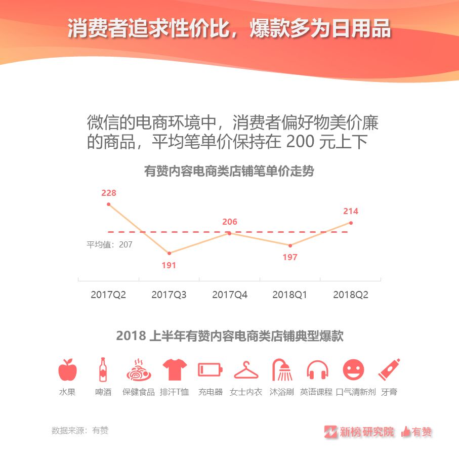 有赞的交易数据显示:2017-2018年,平均笔单价保持在200元上下。比起淘宝、京东式的“购物商场”,微信内容电商更像是“百货超市”。