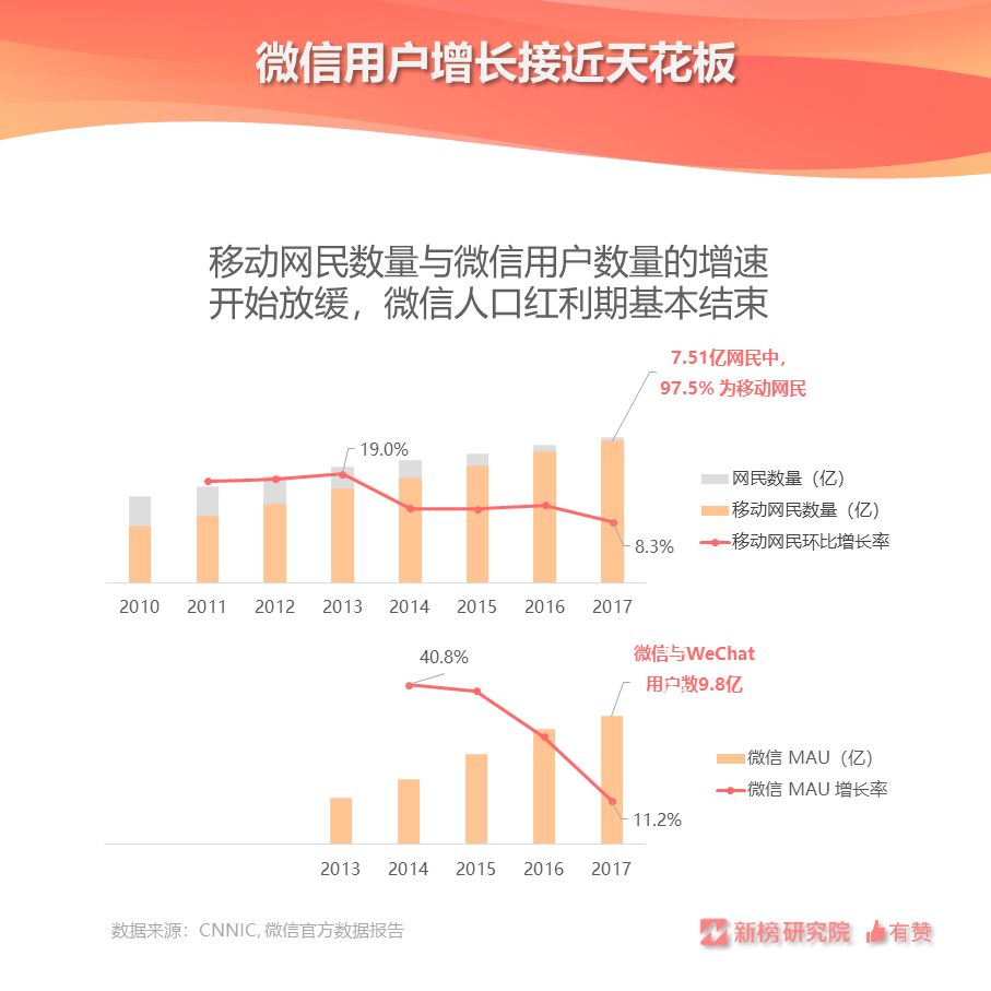 根据CNNIC统计,我国移动互联网用户增速自2016年开始出现下降,2017年微信官方公布用户数据,9.8亿用户已经接近互联网用户的极限。