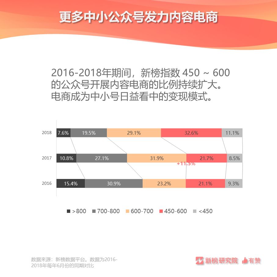 这里面有一个新特点:更多中小公众号发力内容电商。2018年,越来越多新榜指数在450-600分的中小玩家入局,二线城市的公众号比例上升。