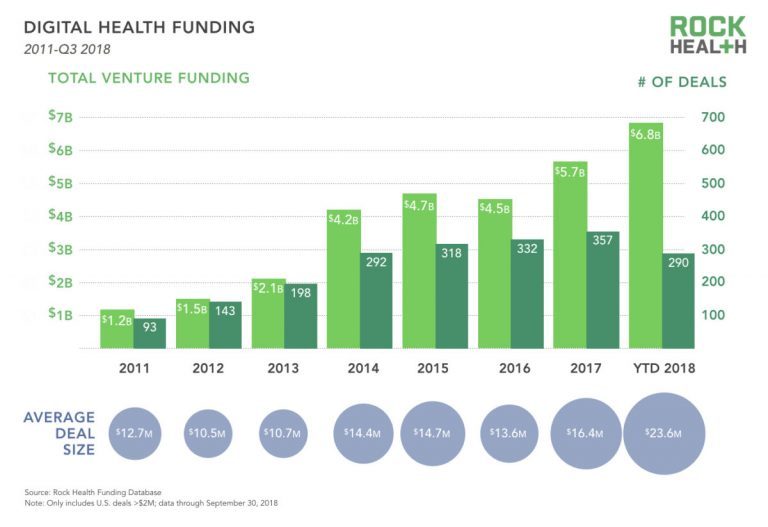 有移动健康医疗界YC大学之称的Rock health发布了一份最新报告,报告显示到2018年还有3个月的时间,但数字健康领域的投资额度(68亿美元)已经超过2017年创下的纪录(57亿美元)。