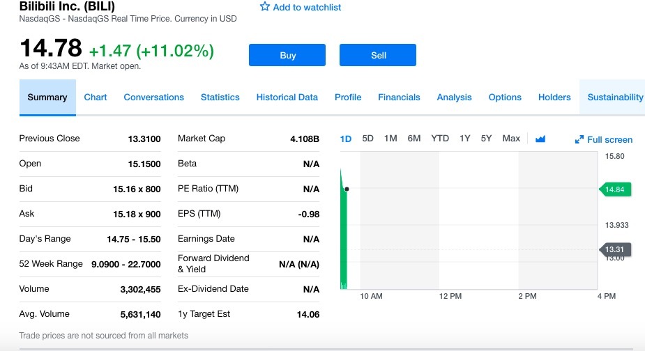 消息公布后,B站盘前涨超14%。截至发稿,B站盘中一度涨幅近16%,目前14.78美元/股。