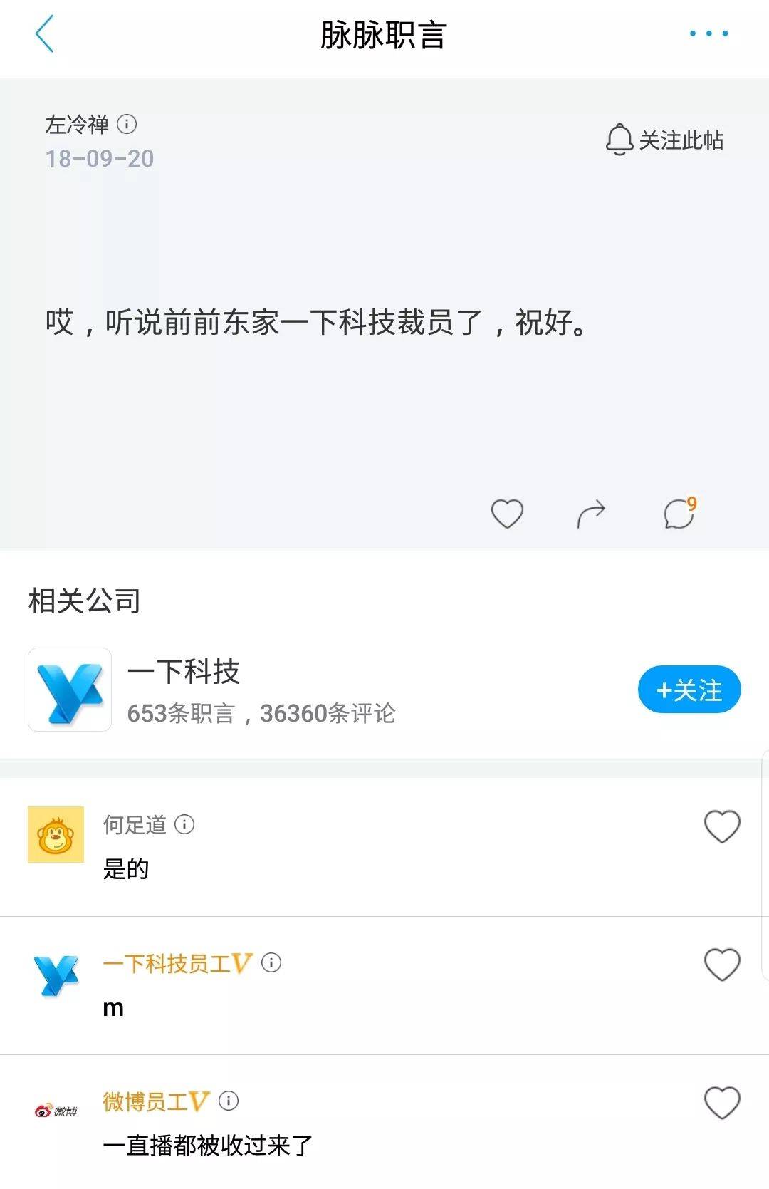 9月20日,用户“左冷禅”发布脉脉职言,“听说前前东家一下科技裁员了,祝好”。按理说,这并没有任何爆点,但楼下一名认证为微博员工的用户却回复道,“一直播都被收过来了。”