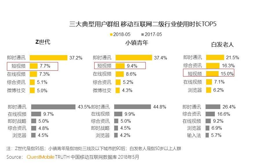 在QuestMobile的统计中,2017年短视频尚未火爆,Z世代、小镇青年和白发老人三大典型用户群组的注意力是放在即时通讯、在线视频、资讯、浏览器等二级行业。而一年之后的今天,短视频就像是一没有天敌的外来物种,打破了原有的生态平衡,迅速圈起了一块属于自己的领土。