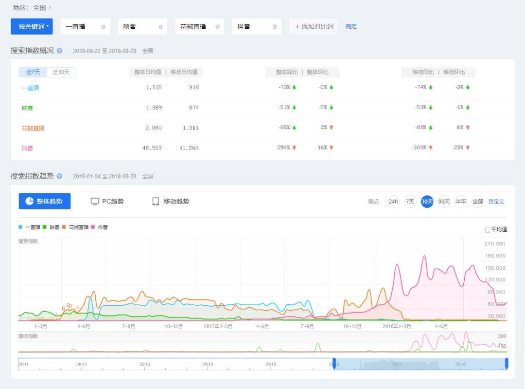 百度指数对这一变迁记录地更为直观,进入2018年,抖音的搜索指数陡增,与花椒直播搜索指数断崖式下跌,一直播、映客匍匐前进形成了鲜明对比。而在今年之前,尤其是2016年到2017年,抖音相较于一直播、映客、花椒直播,显然并不占优。