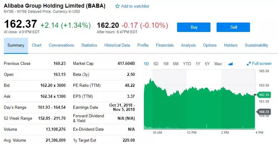 不过阿里巴巴周三略微低开,开盘价为159.79美元,午盘前日高为164.54美元,涨幅不足3%。最终收涨1.34%,报收162.37美元。