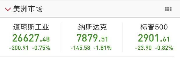 科技股成为下跌主力,特斯拉收跌4.4%,恩智浦收跌3.68%,奈飞收跌3.55%,谷歌收跌2.84%,英伟达收跌2.59%,Facebook收跌2.31%,亚马逊收跌2.22%,微软收跌2.07%,苹果收跌1.76%,英特尔收跌1.29%,IBM收跌1.25%。