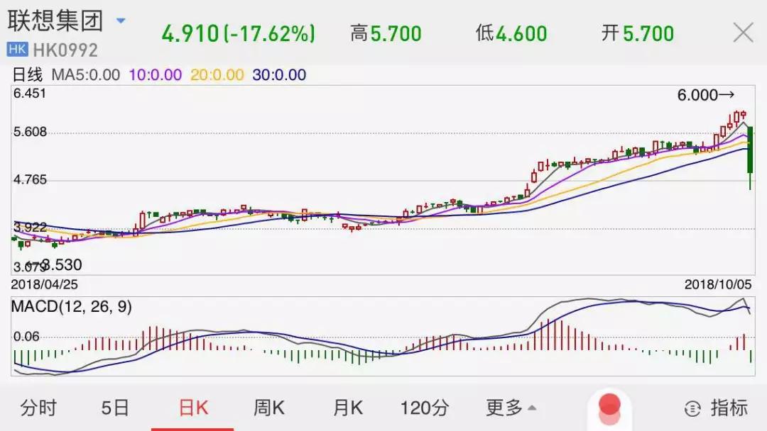 今天(10月5日)9:30港股开盘后,联想集团(00992.HK)股价一路下滑,一度跌破22%,其后震荡拉升,缩小跌幅,截至午间休盘跌17.62%,走出一条惊心动魄的分时线。按照最新每股4.91港元的价格,今天上午联想集团的市值蒸发了126亿港元。此外,联想控股早盘也收跌3.83%。