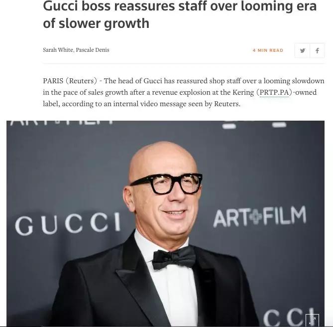 比扎里还在视频中表示,“我们需要认识到,在某一个时间点我们的增长将放缓,我们不能保持每月50%~60%的增长速度,这是不可能的。” 这段近四分钟长的视频是在9月25日~10月3日古驰在巴黎的时装秀之后发布给工作人员的。