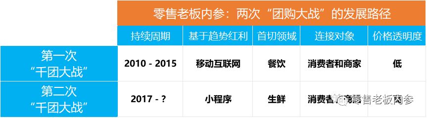《零售老板内参》APP(微信ID:lslb168)通过上述表格的条件对比分析,认为两次千团大战的发展路径将有以下几点规律:
