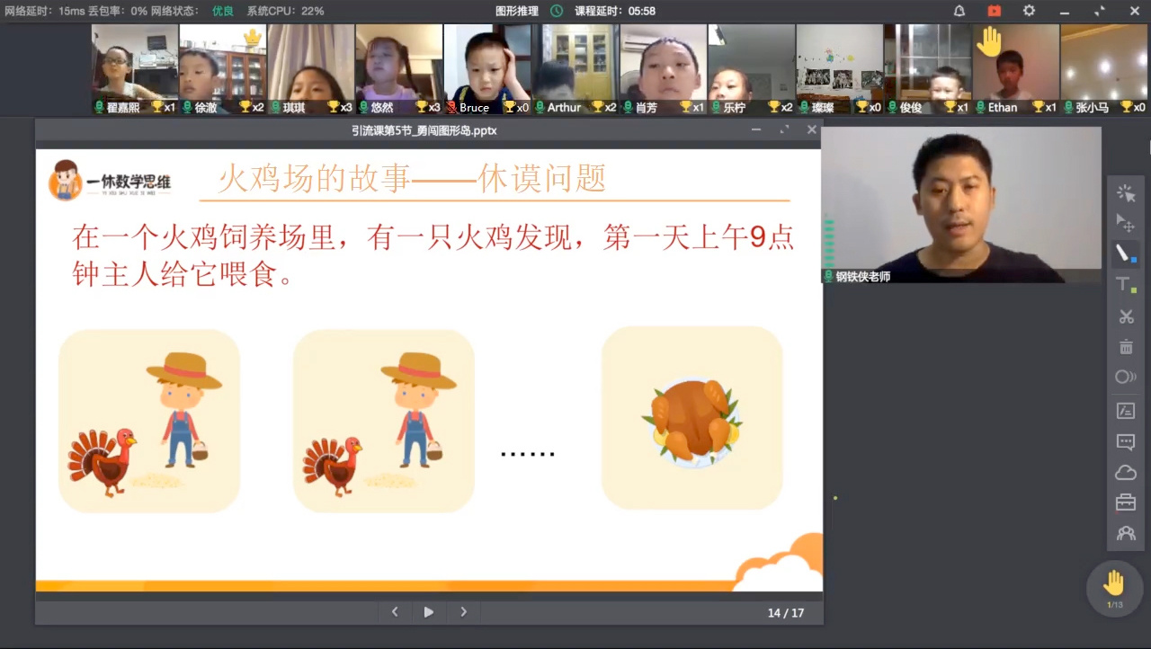 例如,在图形推理课上,在教完传统的根据图形、数字规律推导出下一个的结果后,一休数学会引入火鸡场的故事:一只火鸡科学家总结历史规律,得出“主人每天早上会来给大家喂食”的结论,但它在感恩节公布这条规律时,主人不但没有投食、反而杀了这群火鸡,以此引出“休谟问题”,启迪孩子所有的知识、结论都是在一定的限定条件下才成立的,归纳法不一定普适,需要有质疑精神有批评性思维。