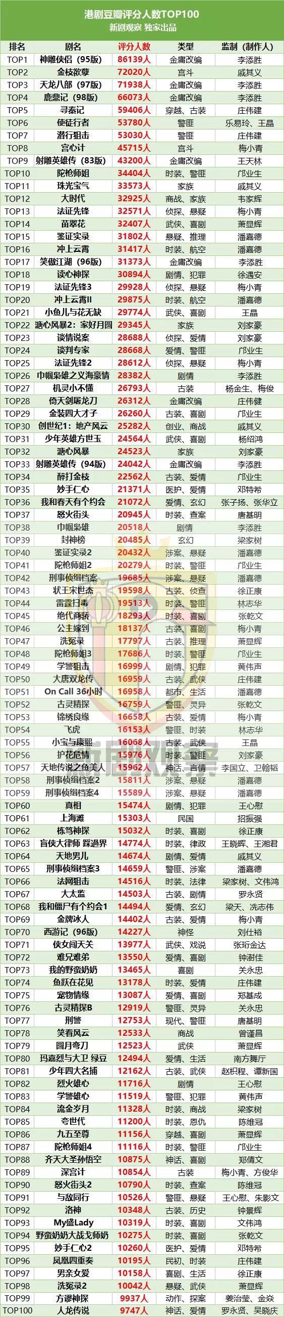 新剧观察(ID:xinjuguancha)本着为国产电视剧制作提供有效信息的态度,集合整理了豆瓣网中受国内观众话题讨论度较高的港剧TOP100剧集信息。综合热度、评分按照评分人数依次排名,为国内电视剧制作方、优爱腾等视频网站打造自制剧/定制剧、各大演员艺人经纪公司甄选剧本以及电视剧引进类型剧集提供建议。