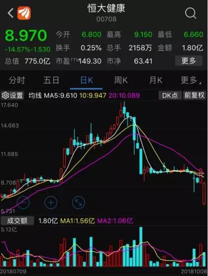 受此消息影响,恒大健康今日(8日)一度暴跌35.24%,随后跌幅收窄,截至午间收盘,报8.97港元,下跌14.57%,市值缩水132亿港元(约合116亿元人民币)。
