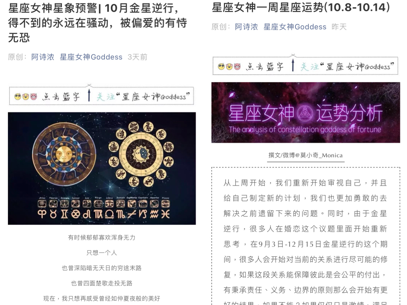 星座女神的线上内容主要可以分为运势预测、占卜、星座课程、脱口秀访谈几部分。运势预测发布在微信公众号“星座女神 Goddess”(粉丝数 150 万)、莫小棋个人微博账号(粉丝数 530 万)以及占星预测 APP “准了”上,所有的运势预测都由在职的占星师编写。