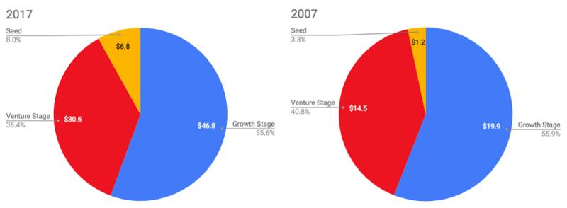如果看看投资额构成时,你会发现创业初期和成长期(非种子期)的投资占到了90%多,而且这个占比在过去10年一直都很稳定。所以尽管种子基金强势涌入,但绝大部分的投资仍然落在传统的初期和成长期基金。