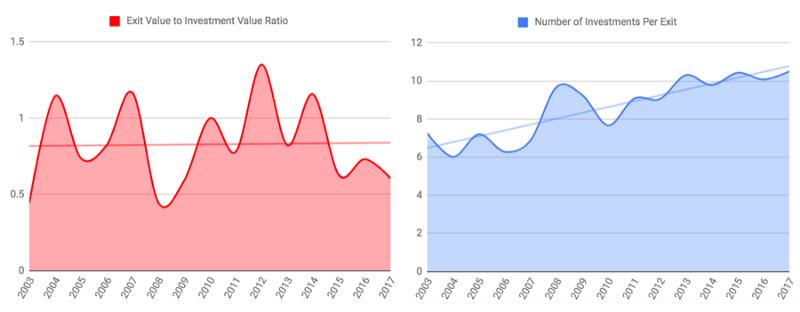 但是这种退出的发展其实是一种误导,因为此间的交易量和交易额也上涨了。退出真正的衡量指标不是绝对数,而应该是与投资的相对占比。如果你做了这种比较之后,展望可能就更有挑战性了。