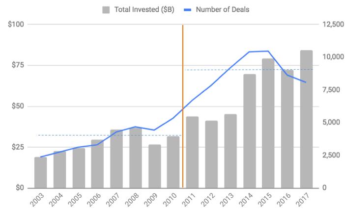 为了了解过去15年风投业的变迁,也为了将这种变化可视化,我收集了Pitchbook的一些指标。下面的第一张图反映的是自2003年以来美国新成立的基金数。从2003年到2011年,每年进行了融资的新基金平均数量为157家。但从2012年往后,这个平均数升到了223,也就是出现了42%的增长,这个速率令人印象深刻。更多基金意味着有更多活跃的投资者致力于这些基金上。