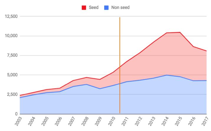 但是如果再看看交易量(而不是交易额)的话,一个不一样的故事就出现了。尽管过去10年非种子期的交易量涨了20%,但同期种子期的交易量却飙升了400%。自从2011年以来,种子期交易量的年均值(4300)现在已经跟非种子期的交易量(4500)持平。