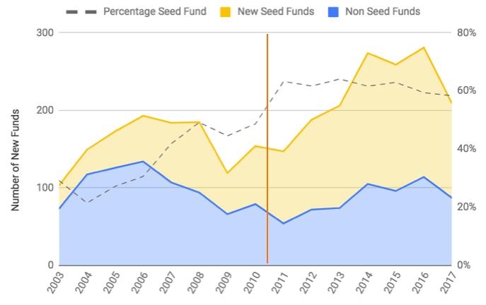 为了再仔细看看融资的都是什么类型的基金,我将美国的风投资金拆分成了种子基金与非种子基金(比如创业初期和成长期基金)。沟渠15年非种子基金的占比相对稳定在90的水平。但是融资的种子基金的占比却变化很大。在2003年至2010年期间,平均每年融资的种子基金数为5,但过去7年该数飙升至137(增长了2.3倍)。换句话说,最近基金数量的增长都是种子资金贡献的,而不是创业初期或者成长期基金。自从2011年以来,每年新融资的基金里面有60%都是种子基金(相比之下下10年这个数字还不到30%)。