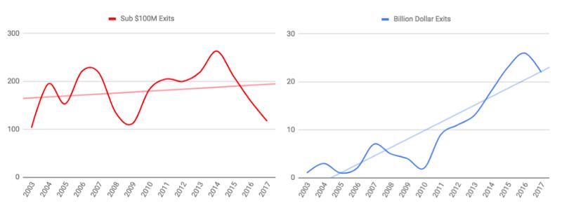 为了说明这一点,我在下面绘制了过去15年的两类初创企业退出。左图是每年退出价值不超过1亿美元的交易数,从趋势线看只是升了一点点。但是在右图中可见,每年退出价值超过10亿美元的交易数就上涨得很快。就平均数而言现在的10亿美元及以上退出数是10年前的7倍多。去年退出价值达10亿美元的交易数约占总交易数的10%,但是这个小群体却占到了总交易额的60%。
