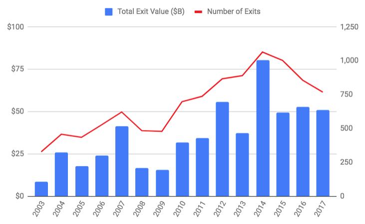投资只是风投资本方程式的一头。另一头是这些投资的回报。那么随着过去15年投资活动的显著增长,回报情况如何呢?就整体而言,相当不错。过去15年的总退出(初创企业上市或者被收购)数涨了2倍,而这些退出的价值也涨了3倍,自2015年以来年平均回报达到了500亿美元。