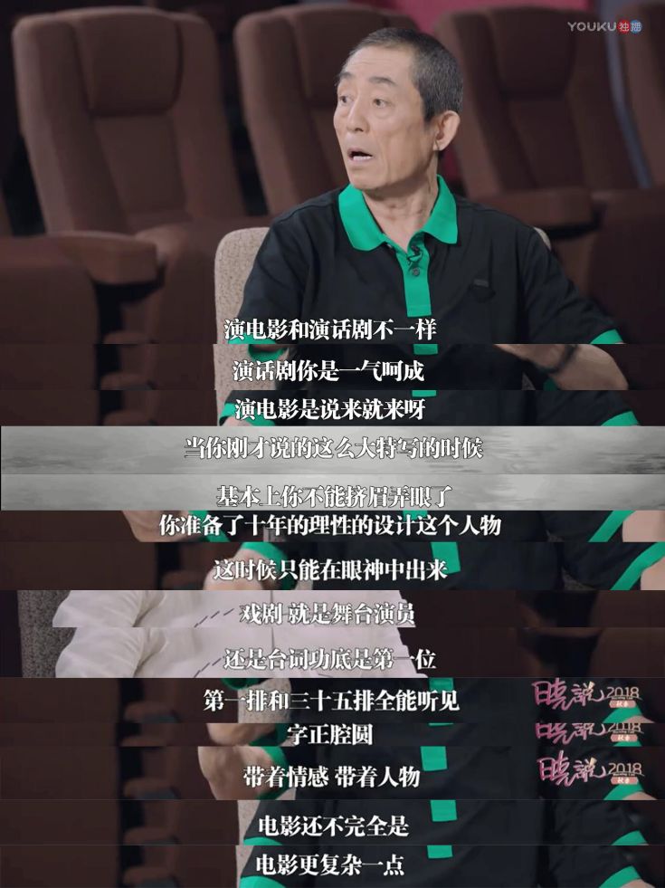 张艺谋在先前参加《晓松说》时曾经谈论过关于话剧表演和电影表演的区别: