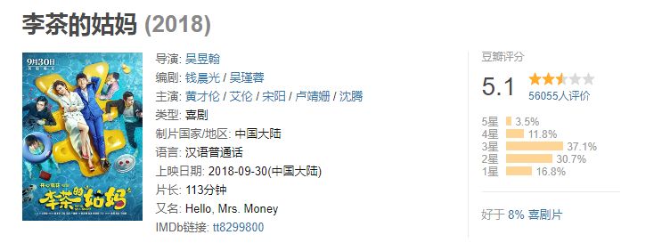 本应该是今年国庆档领跑票房的《李茶的姑妈》,豆瓣评分垮到了5.1分,不仅成为了开心麻花电影口碑最差的一部,票房相比去年同档期的《羞羞的铁拳》也有大幅度下滑,最终将国庆档冠军的宝座拱手相让给了《无双》。