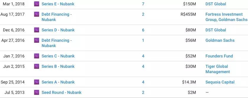 Nubank的主营业务是虚拟信用卡,于2013年成立于巴西。在腾讯注资之前,已经先后获得了5轮融资。今年年初,Nubank获得由DST Gobal领投的1.5亿美元E轮融资,晋级为独角兽。