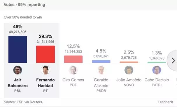 10月7日的第一轮大选中, 博尔索纳罗获得了将近半数的选票,然而因为直接超过半数而没能直接当选。 几周后的第二轮博尔索纳罗和劳工党的哈达特谁会胜出还真说不好。