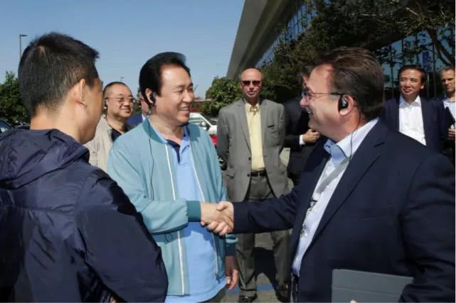 图说:恒大集团董事局主席许家印(左二)一行抵达FF总部, FF创始人贾跃亭(左一)在照片中只有一个背影。