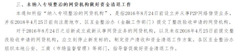 无独有偶,9月21日,广州市金融工作局发布《市互金整治办关于转发进一步组织辖内P2P网贷机构做好合规自查的通知》(下称“通知”),其中也明确表示,未纳入专项整治的网贷机构要做好资金清退工作,立刻停止新发标的,并制定资产清收和资金清退工作方案。