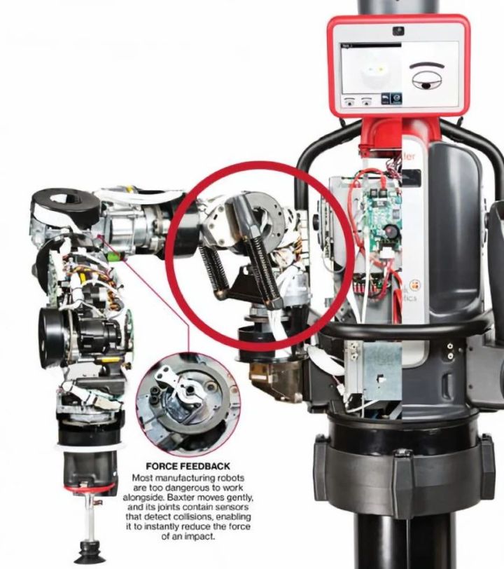 设想:一个人拿着竿子打枣,竹竿越硬末端晃动越少,操作也越精确;但竿子越硬,打到人时就越危险,同时也越难控制末端的力度。传统机器人追求高刚度,即做成很硬的竹子(以期更高的精度和速度),Baxter则反其道而行之,在机器人关节中内置了弹性元件SEA。这样可以极大地减少机器人在发生碰撞时的力量,让机器人更安全,同时让机器人做力控时更柔顺。
