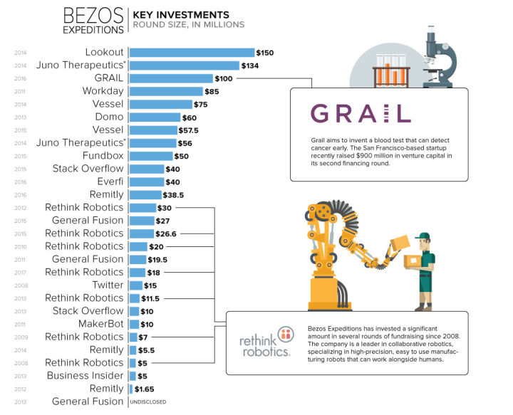 新晋世界首富,亚马逊创始人Bezos,也是一位投资大佬。