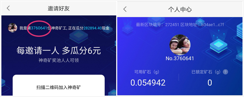 最后,关于神奇矿我还有一些疑问。比如,它会给每个注册用户一个编号,按理说它可记做 abcdefg,也可以像身份证号那样设置 18 位数字。但在邀请好友界面中,个人编号变成了“我是第3760641”位矿工,见下图: