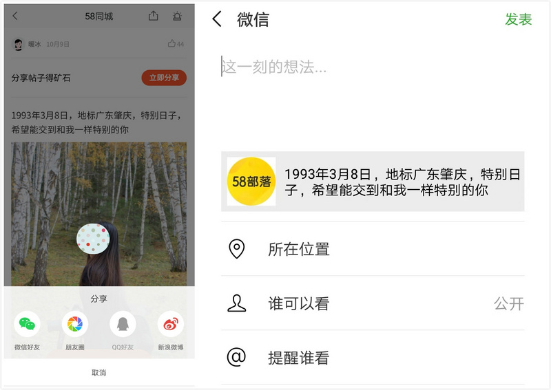 帖子内容来自 58 同城的“部落”用户,相当于基于地理位置的“微博”。帖子主题多是征友、生活随感,还有平台发起的“寻找同年同月的你”等活动。我尝试分享了一个链接,发现链接的界面设计有点简单粗暴,内容质量也很难和微博、知乎等内容社区比。