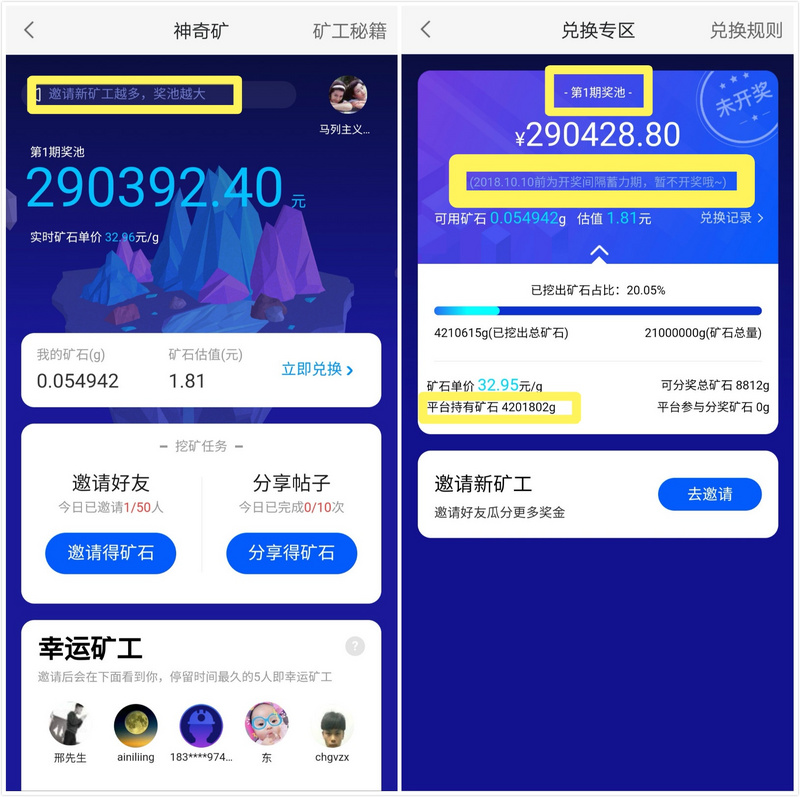 尽管不知道神奇矿上线的具体日期,但从网友提供的资料看,神奇矿在 9 月 24 日时已经上线,由此算来开一次奖少说也得过半把个月;加上“在榜时间”的规则,现在大家知道,为什么叫“幸运矿工”了吧,中奖的概率是很低的。