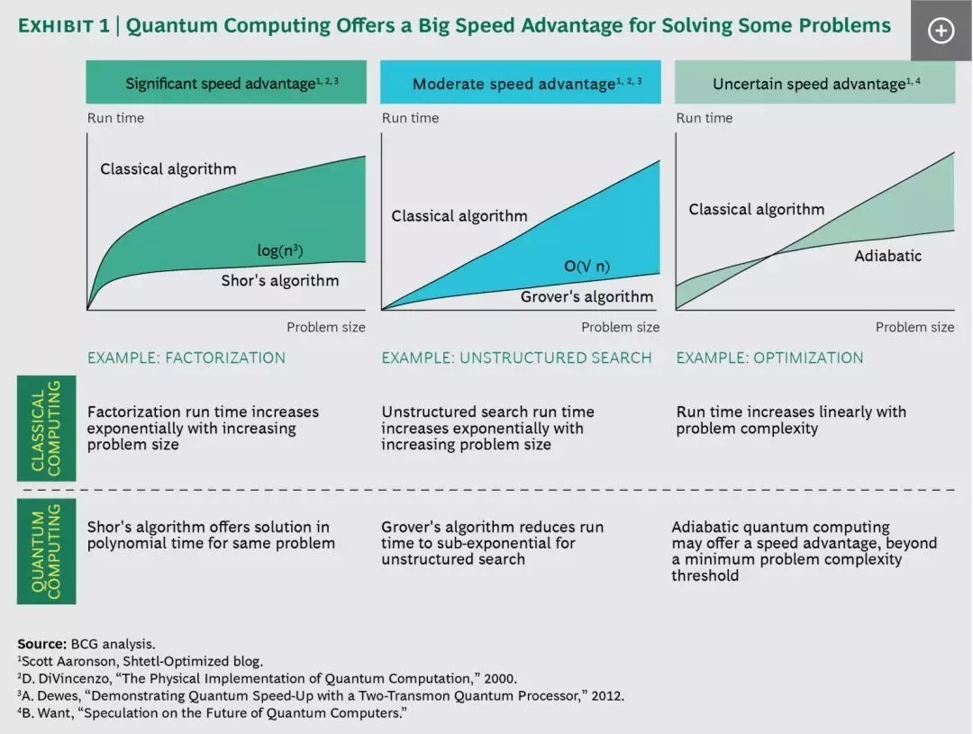 波士顿咨询针对一些计算负载远高于当前计算能力的应用进行了研究。并将问题分为三种类别,分别绘制出量子方法与传统方法所需的计算时间函数。(如下图)