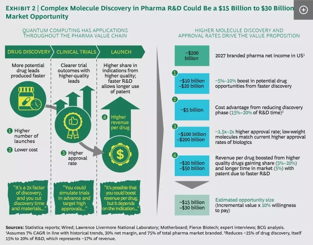 波士顿咨询预计,到2030年,量子模拟技术将催生一个高达200亿美元的药品市场,以及70亿美元的包括化学、材料科学及其他材料密集型产业在内的市场。
