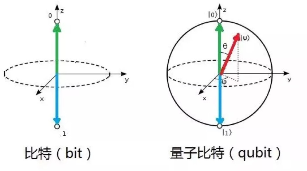 一个量子比特(可以同时处于0和1的量子状态)可以用图中的布洛赫球(在量子力学中,布洛赫球面是二能级量子力学系统纯态空间的一种几何表示方法)来表示。相比于经典比特(信息量的最小度量单位)只有0和1两个点,量子比特的取值分布在整个球面上,即球面上任意一点都可以是某个量子比特的值。这也是为什么量子计算机的运算速度可以远超经典计算机。