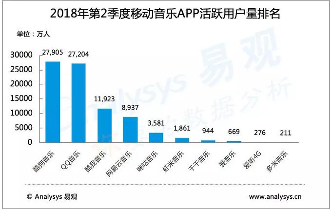但是,融资、改名之后的千千音乐除了名字更改之外,并没能让外界看到太多的改善。靠情怀再赢回市场的做法也没被消费者认可。根据易观千帆的数据显示,截止2018年第二季度,千千音乐的活跃用户仅为944万人,位列TNBA四家中的末尾。
