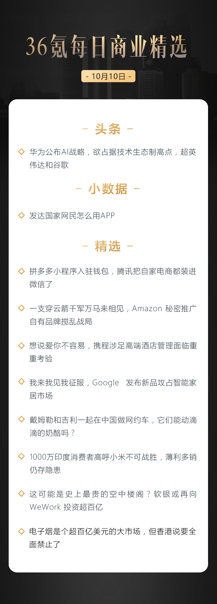 本文来自36氪付费栏目《36氪每日商业精选》——10月10日