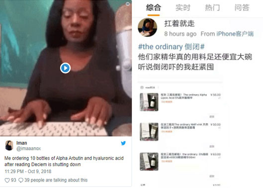 这个爆炸性的消息一出,很多妹子不淡定了,随之而来的是疯狂的买买买。一位女用户在Twitter上发文称,在听说The ordinary即将关闭后,自己加购了10瓶精华。而在微博,“The ordinary倒闭”的话题下面,最常出现的两个词是“囤货”和“拼单”。