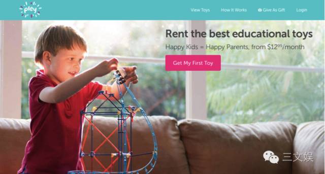 Pley:一个玩具共享平台,用户每月缴纳一定的费用后,可在有至少500种玩具的平台上任意选择,并由Pley快递到家,且玩具允许长期留在身边。目前已获得超过1600万美元的风险投资。
