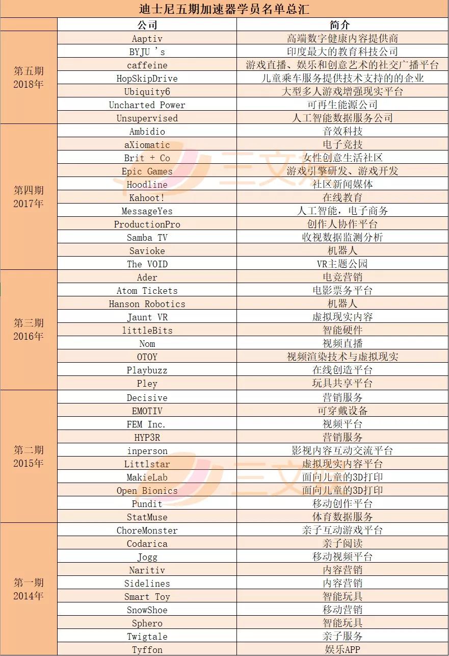 几年前,迪士尼就成设了自己的加速器,投资初创科技公司以寻求多元、深入的行业布局与服务。截至目前,迪士尼加速器已经举办了五期,总共孵化47家公司。
