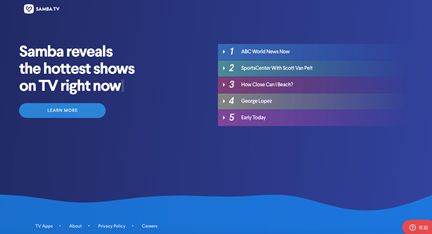 Samba TV:收视数据分析公司,监测广播、电视、数字媒体等平台的实时收视数据,为营销人员提供数据支持。