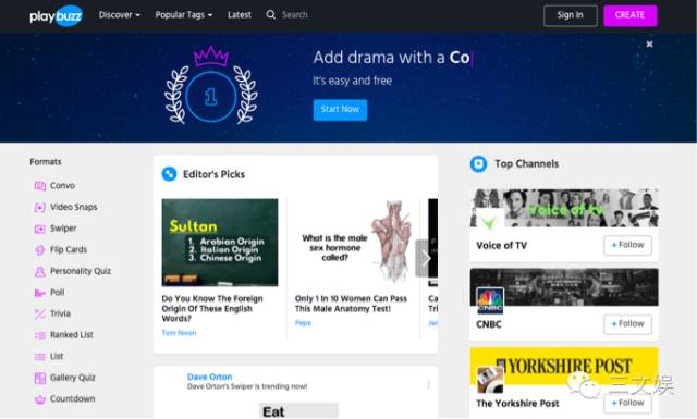 Playbuzz:一个娱乐休闲内容在线制作平台,提供各种各样的模板帮助出版人、营销人和博客作者等制作小型视频、个性测试、民意测验、冷知识、排行榜、倒计时。目前已获得3100万美元的投资。