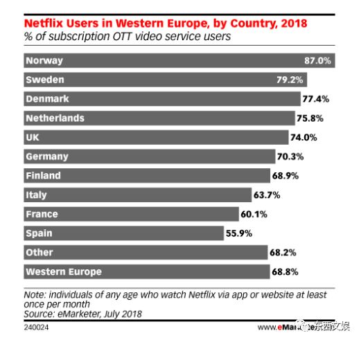 今年7月,eMarketer追踪了Netflix的全球订阅用户,发布了一些最新预测,其中欧洲市场的结果显示: